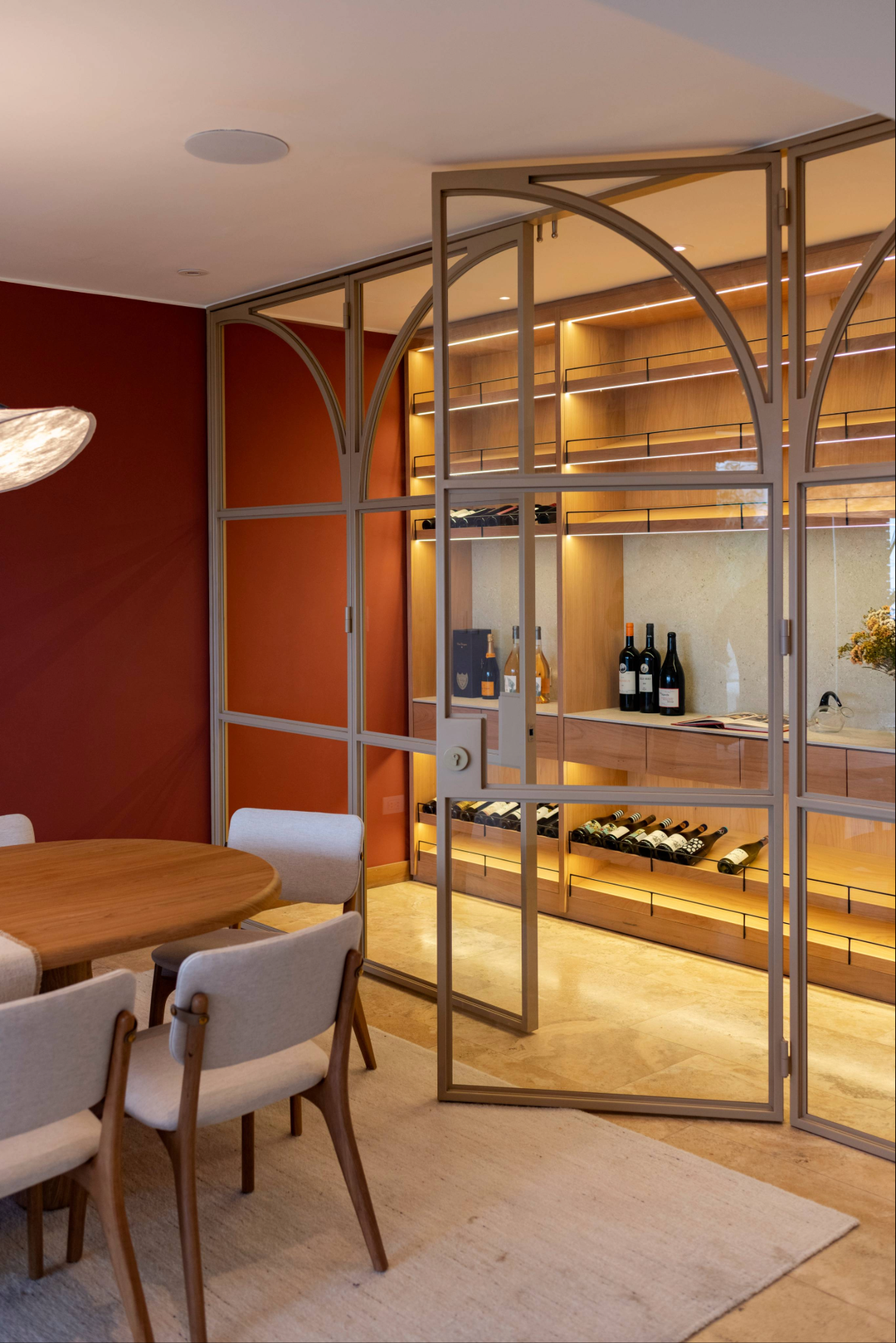El comedor de la Casa AlGa se concibe como un espacio íntimo y contenido, donde la cava se convierte en el corazón del proyecto. Más que un elemento funcional, es un gesto arquitectónico que organiza el ambiente: un volumen cálido, revestido en madera, que envuelve y exhibe cuidadosamente cada botella, acompañado por una iluminación indirecta que acentúa texturas y genera una atmósfera acogedora y casi ritual.