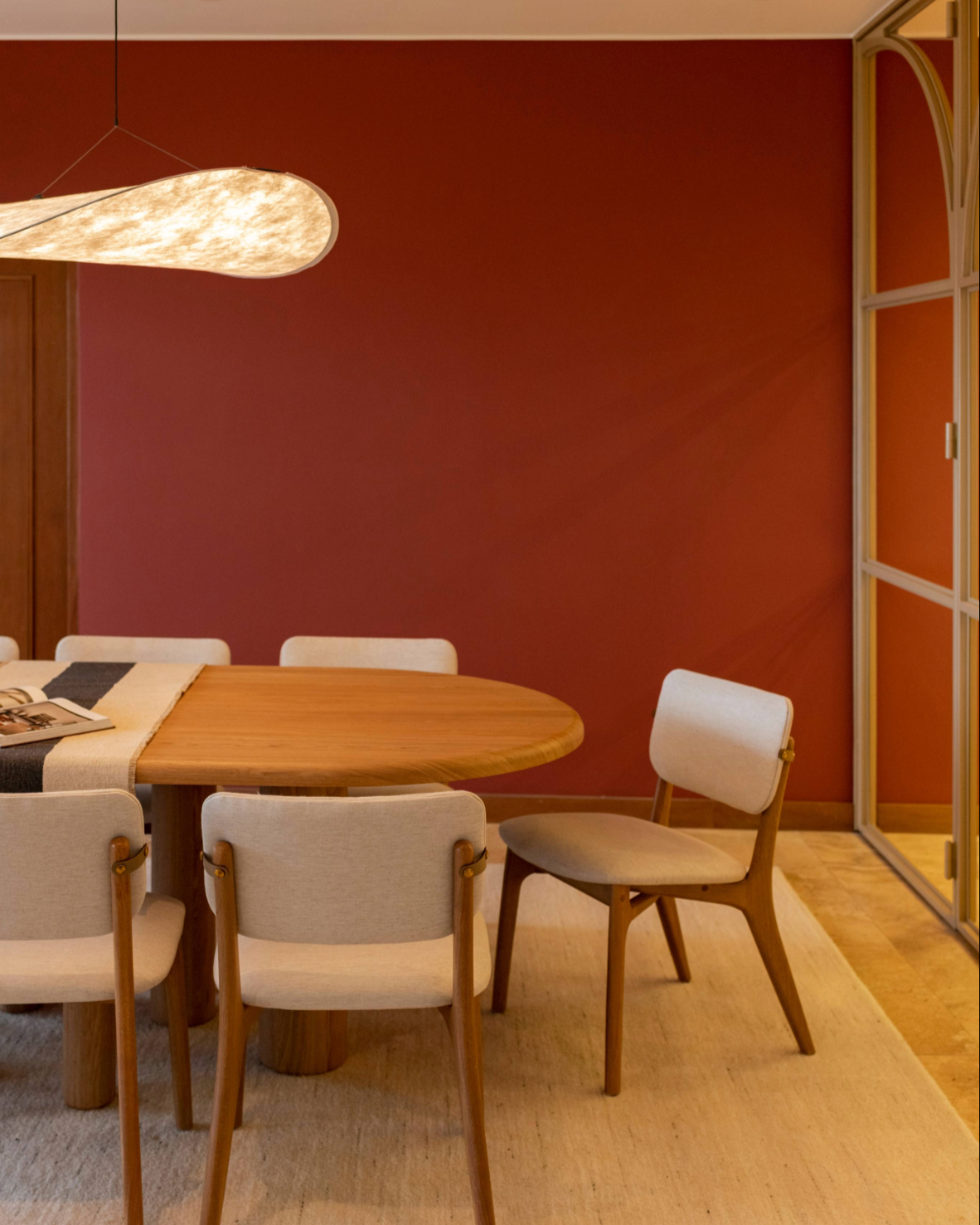 El uso de tonos terracota en los muros aporta profundidad y carácter, contrastando con la calidez natural de la madera y la sutileza de los planos claros en piedra. Este equilibrio material construye un ambiente sofisticado pero cercano, donde cada elemento está pensado para acompañar la experiencia de reunirse, compartir y disfrutar. La mesa, de líneas suaves y orgánicas, dialoga con sillas de tapizado claro, generando un contrapunto ligero dentro de una paleta envolvente.