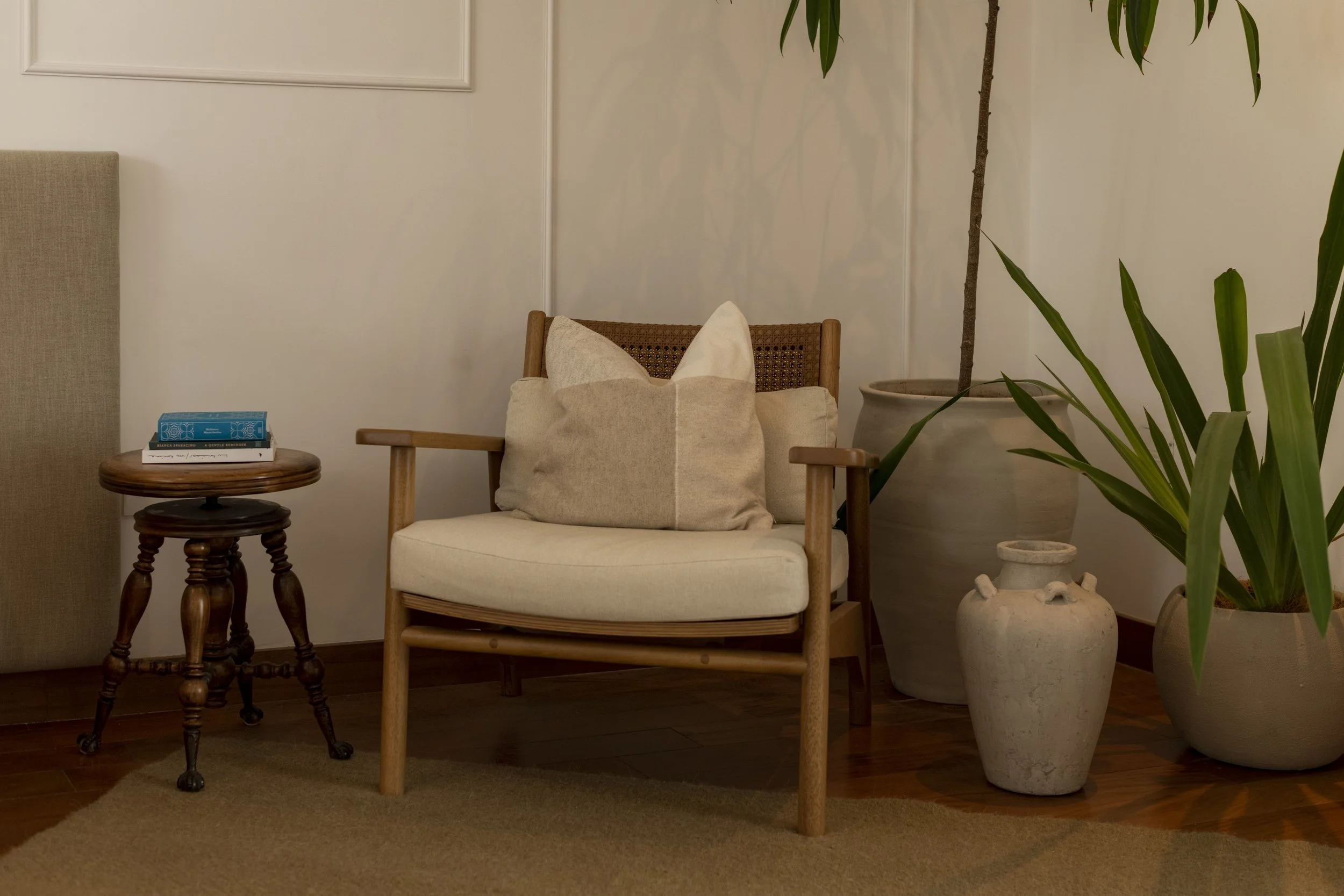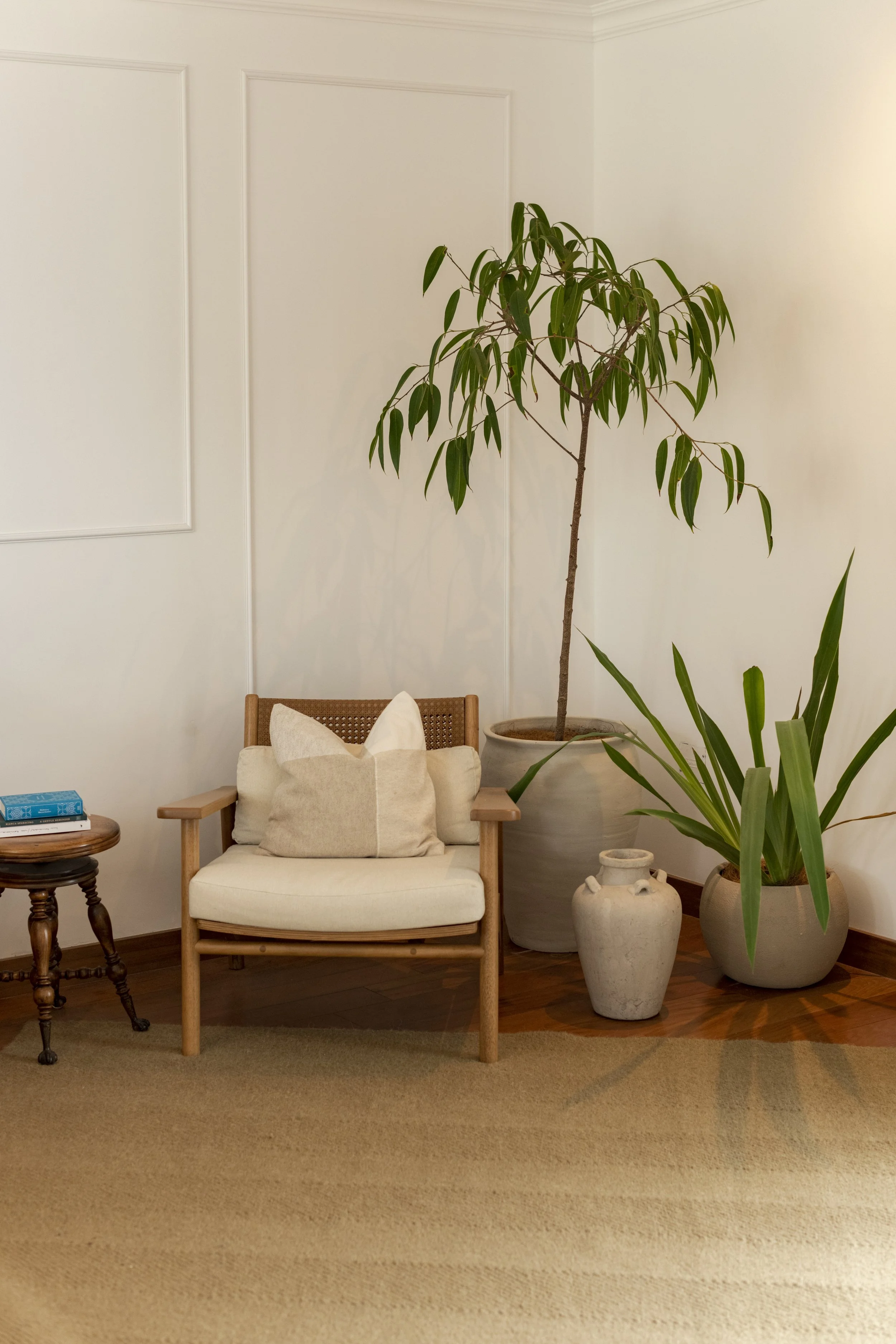 Un pequeño rincón de lectura, acompañado por vegetación, suma una capa de intimidad y conexión con lo natural. Los objetos se incorporan con intención —libros, cerámicas, textiles— reforzando una estética sencilla y atemporal.