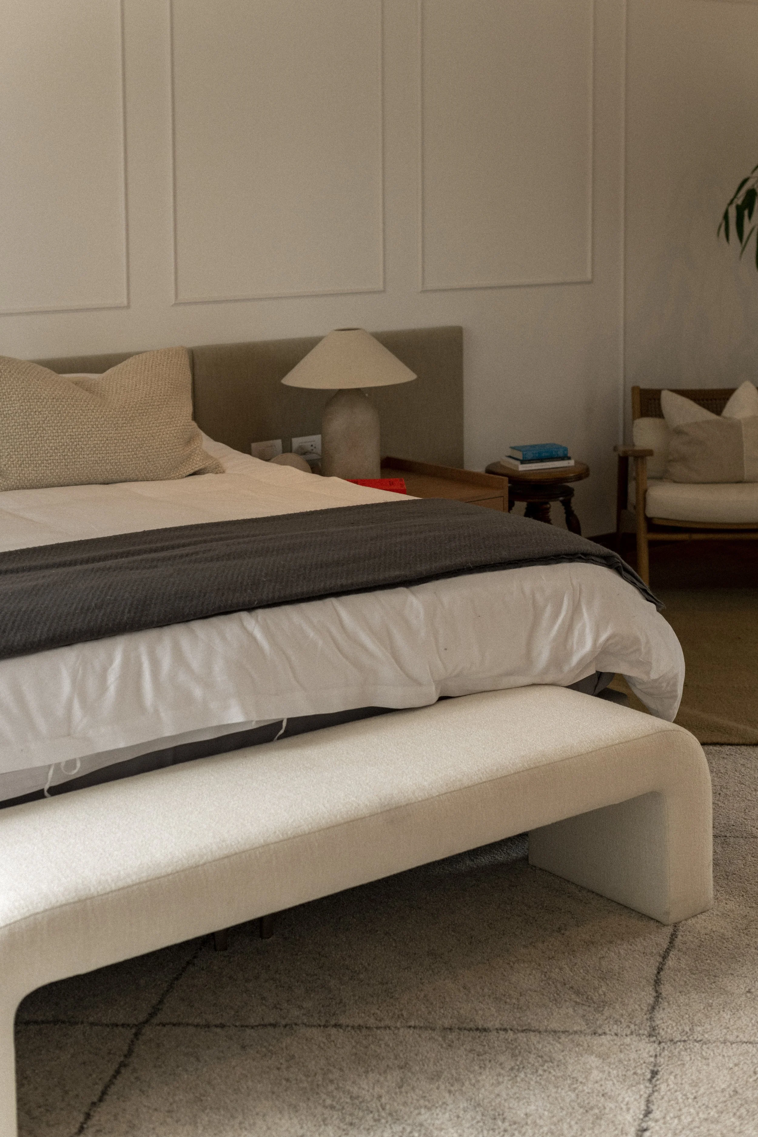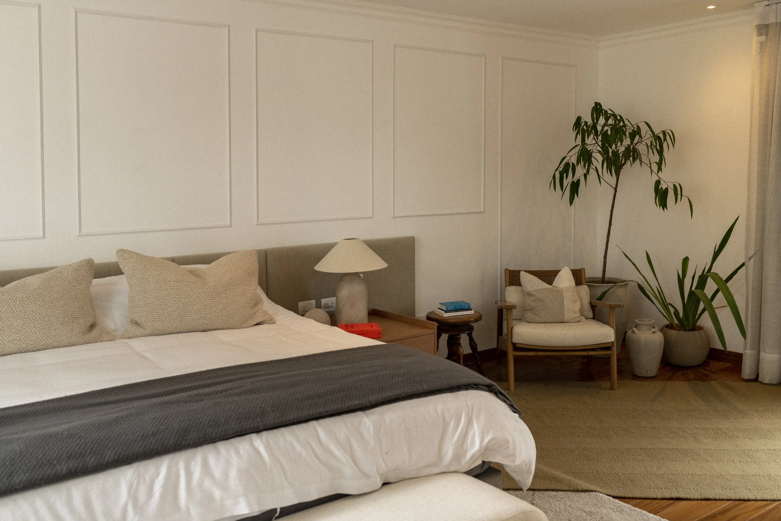 El dormitorio de la Casa AlGa se concibe como un espacio de descanso sereno, donde la calma se construye a partir de una paleta neutra y una composición cuidadosamente contenida. Los tonos arena, blancos y grises suaves envuelven el ambiente, generando una atmósfera cálida y silenciosa que invita a desconectar.