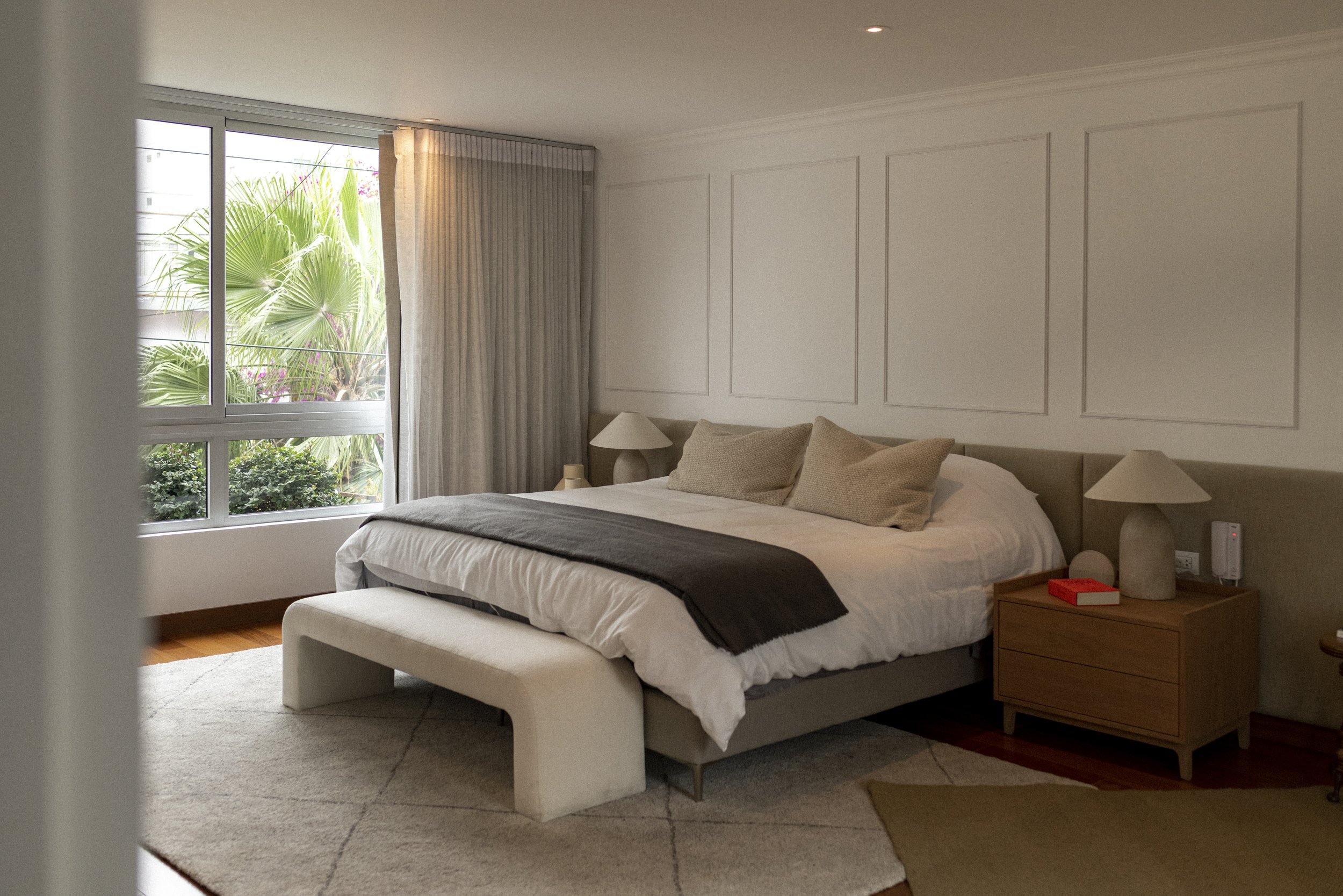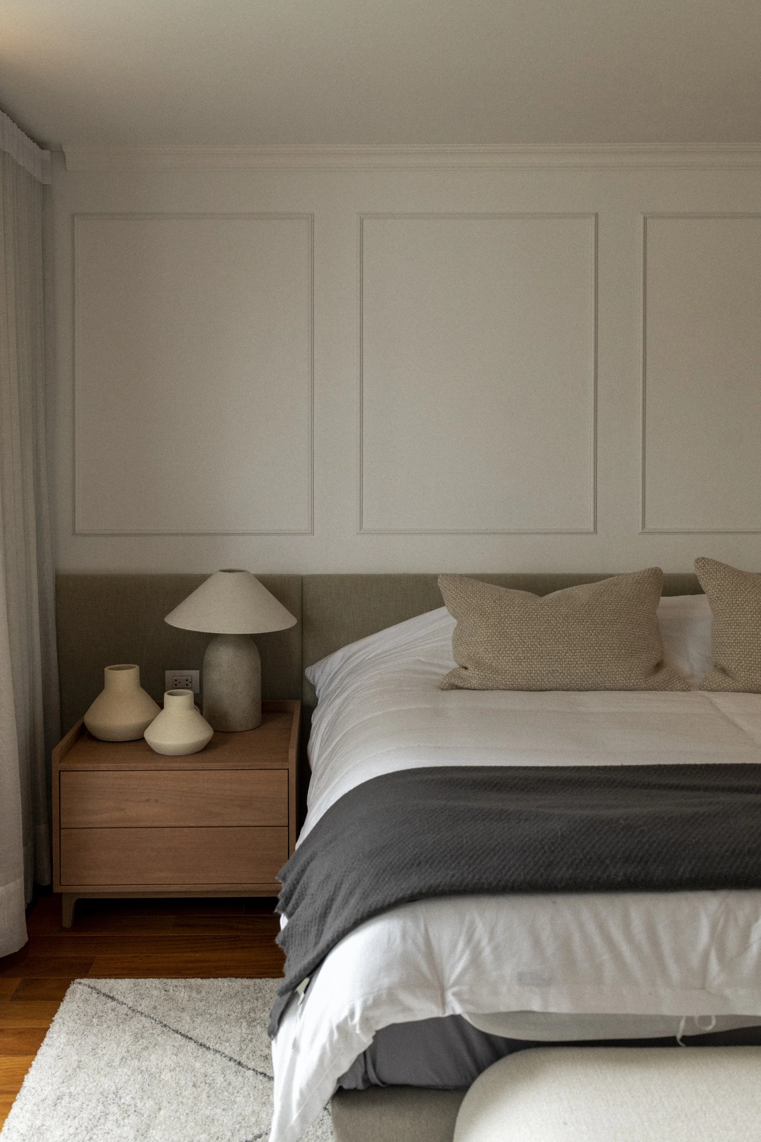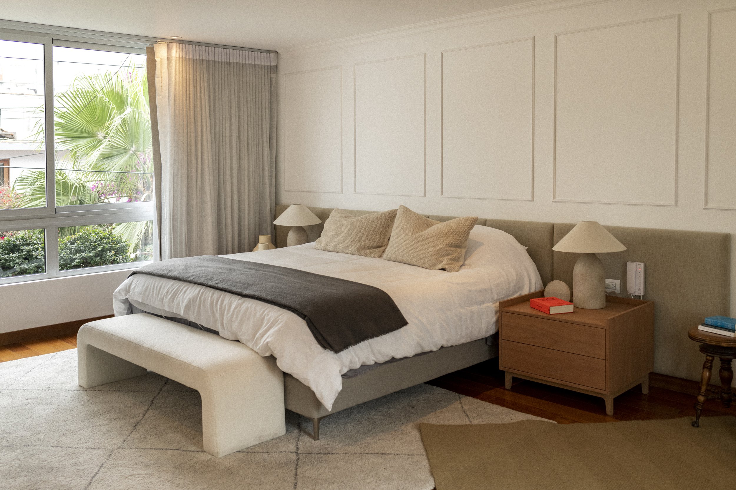 El respaldo tapizado, continuo y sobrio, se integra con los muros panelados, aportando textura sin recurrir a elementos decorativos excesivos. La madera, presente en las mesas de noche y detalles puntuales, introduce una calidez natural que equilibra la neutralidad del conjunto. La iluminación, a través de luminarias de formas orgánicas y materiales mates, acompaña el espacio de manera suave, sin protagonismo.