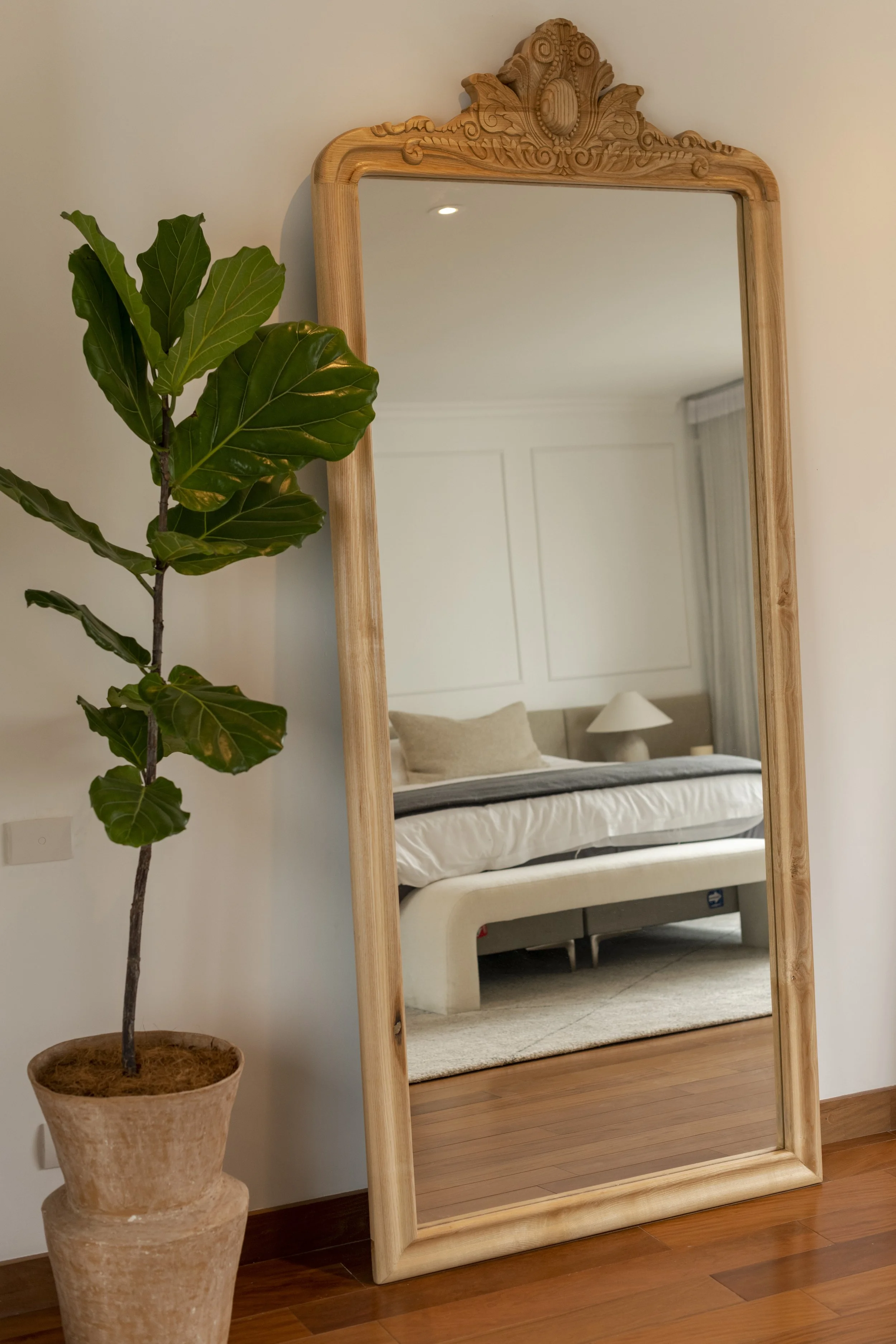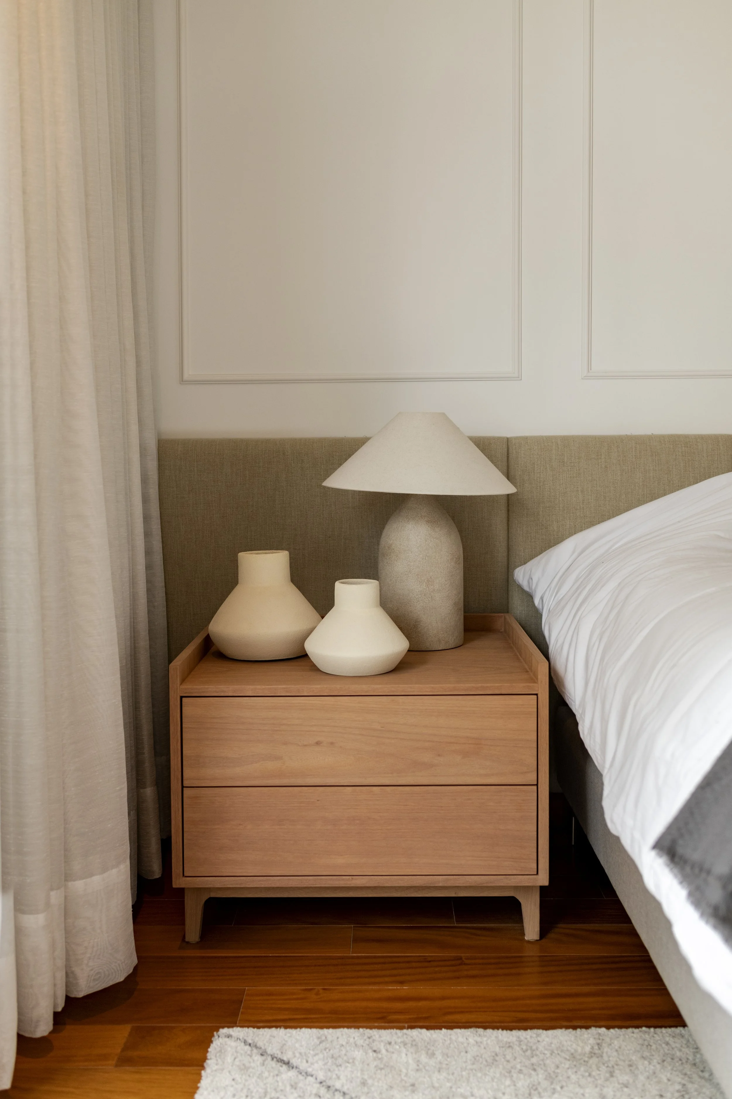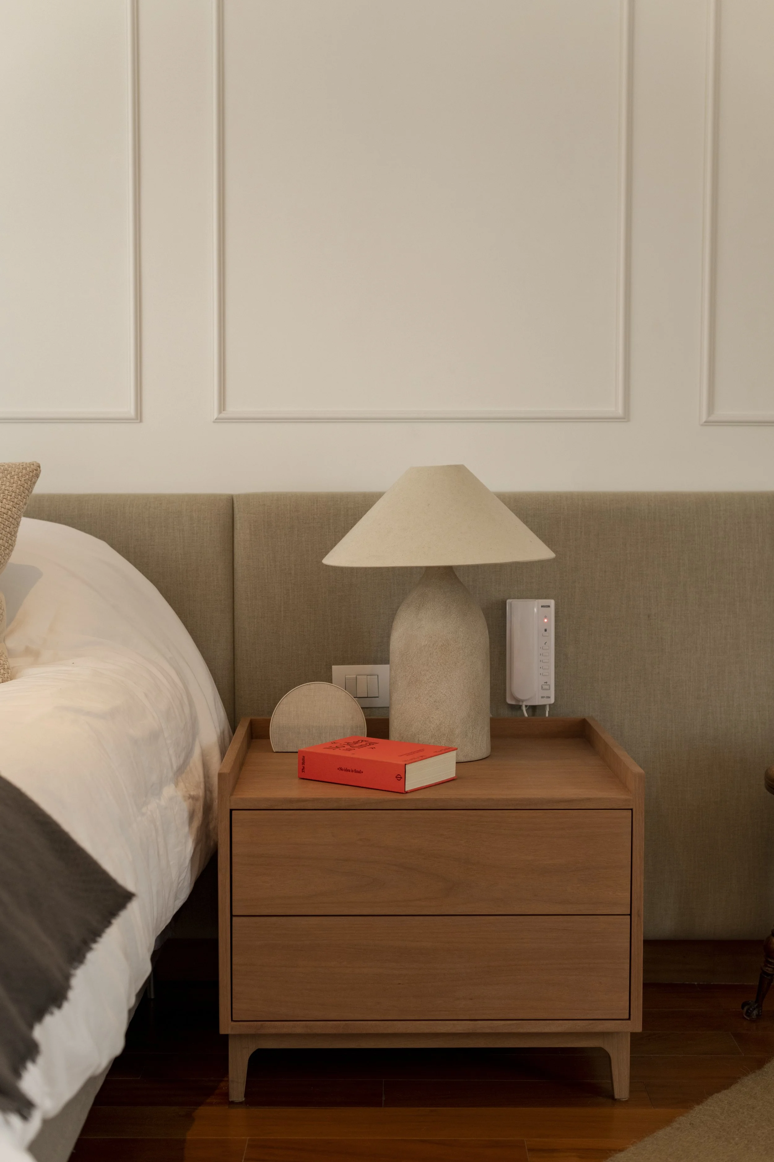 El respaldo tapizado, continuo y sobrio, se integra con los muros panelados, aportando textura sin recurrir a elementos decorativos excesivos. La madera, presente en las mesas de noche y detalles puntuales, introduce una calidez natural que equilibra la neutralidad del conjunto. La iluminación, a través de luminarias de formas orgánicas y materiales mates, acompaña el espacio de manera suave, sin protagonismo.