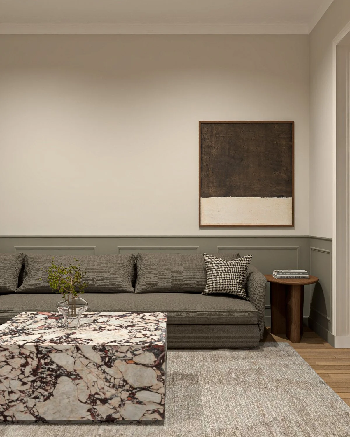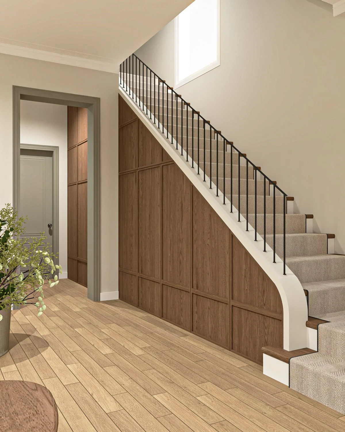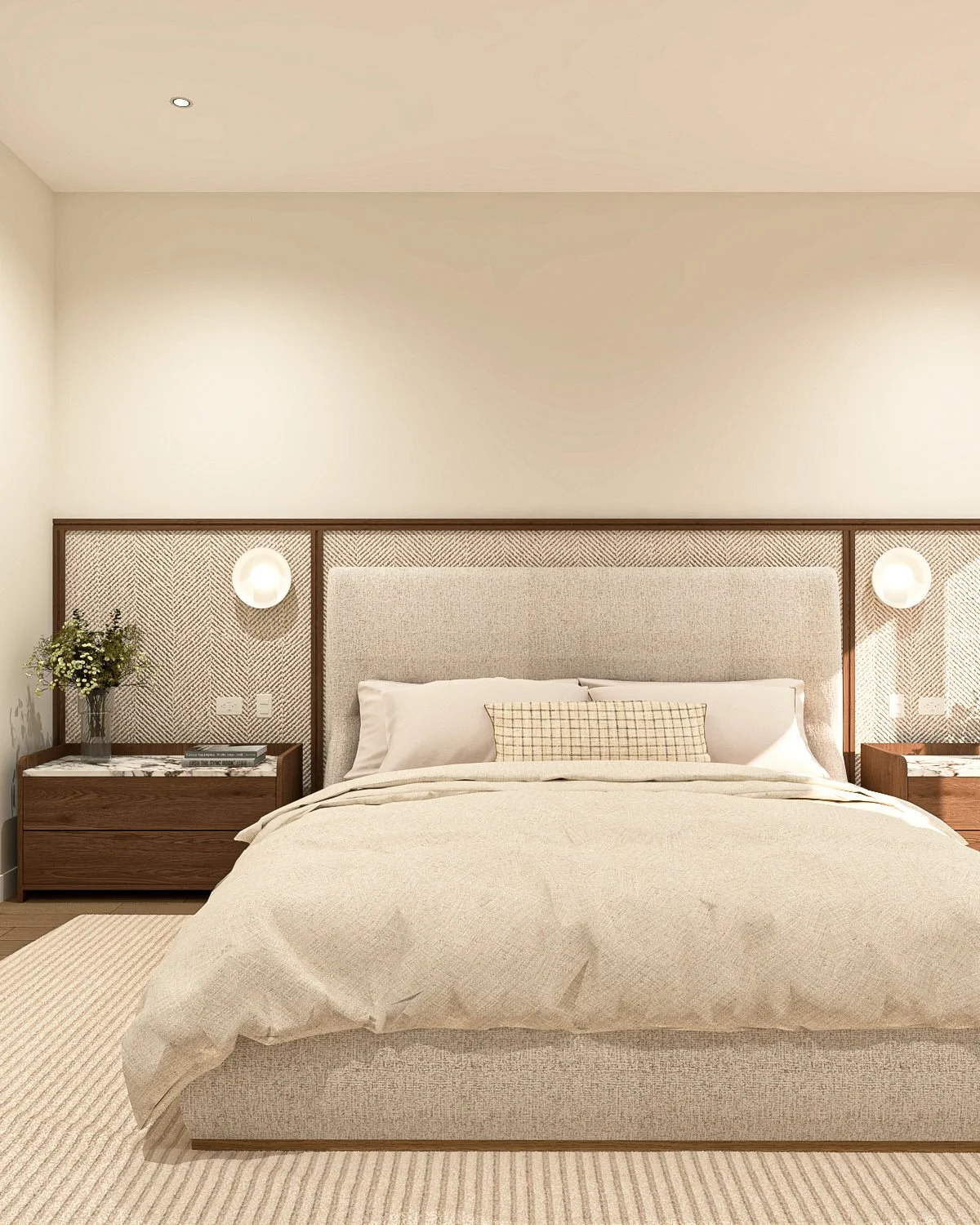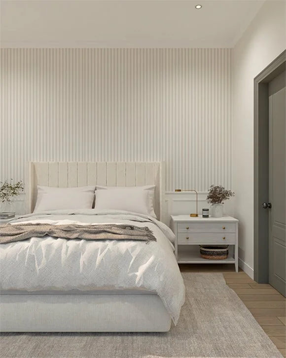 La madera se convierte en un hilo conductor que recorre los distintos ambientes, aportando calidez y continuidad. Se combina con una paleta neutra —blancos, tonos arena y grises suaves— que permite que la luz natural sea protagonista y que los espacios se perciban amplios y serenos. Los revestimientos, como los panelados y detalles lineales, introducen ritmo y textura sin recargar.