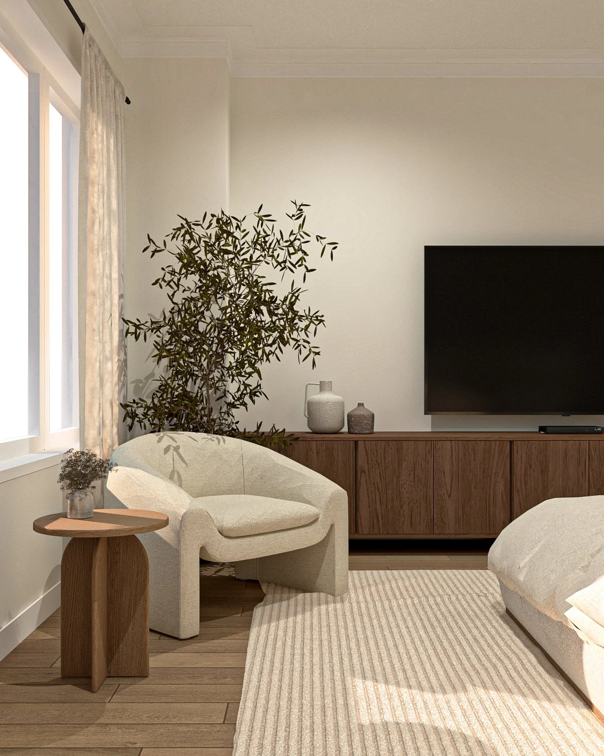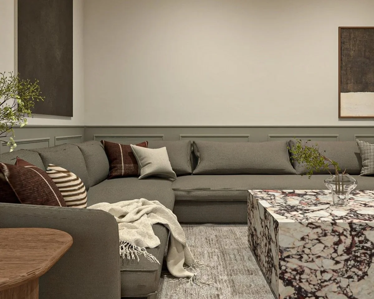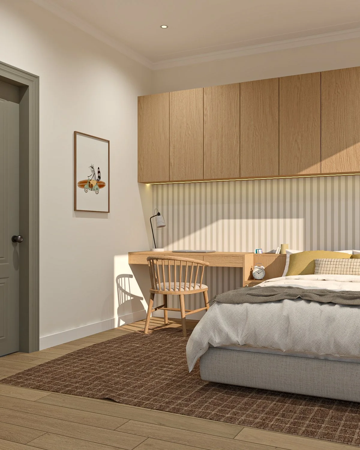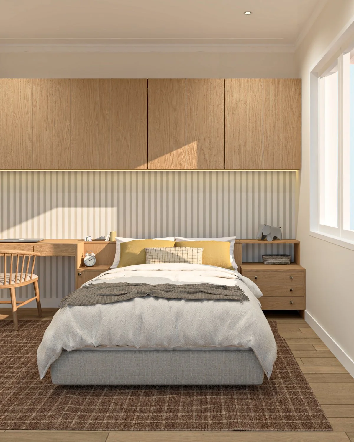 La madera se convierte en un hilo conductor que recorre los distintos ambientes, aportando calidez y continuidad. Se combina con una paleta neutra —blancos, tonos arena y grises suaves— que permite que la luz natural sea protagonista y que los espacios se perciban amplios y serenos. Los revestimientos, como los panelados y detalles lineales, introducen ritmo y textura sin recargar.