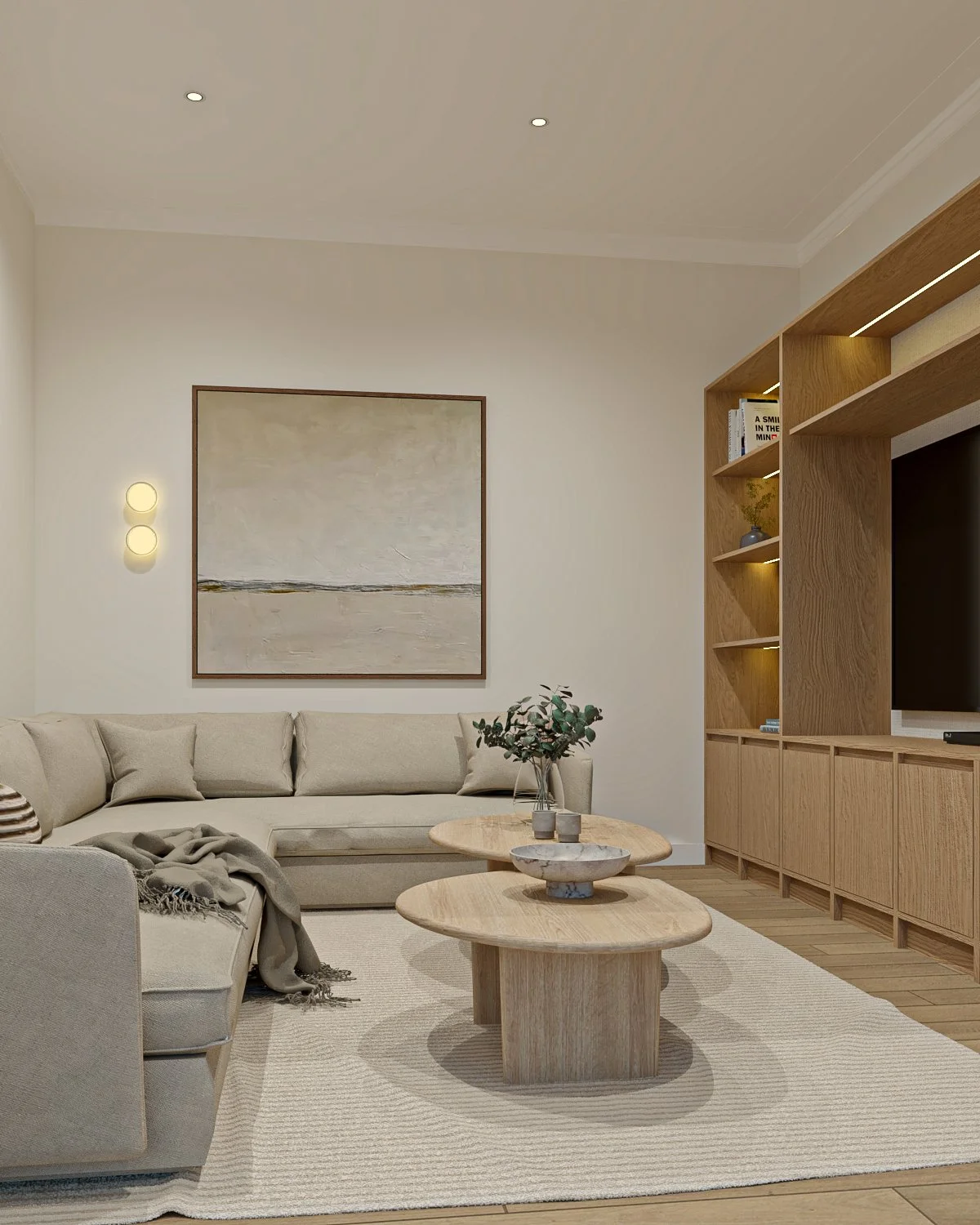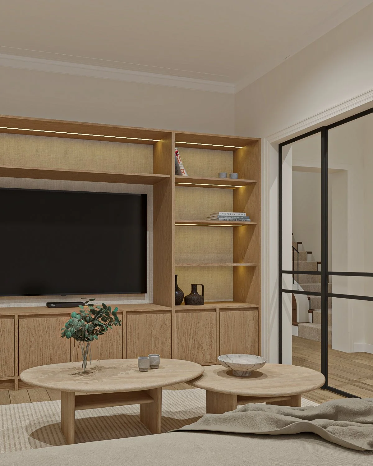 El mobiliario a medida organiza cada ambiente con claridad: libreros, muebles de TV, cabeceras y escritorios se integran a la arquitectura, resolviendo funciones específicas mientras mantienen un lenguaje común. La iluminación y los objetos acompañan desde la sutileza, reforzando una atmósfera doméstica, acogedora y atemporal.