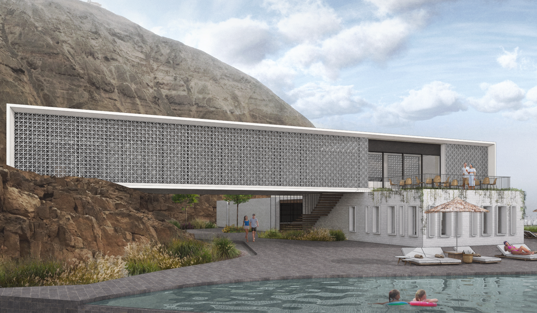 La arquitectura se construye desde una materialidad contenida y honesta, donde los muros calados filtran la luz y el viento, creando una envolvente que protege sin aislar. El proyecto prioriza los recorridos, las transiciones y los espacios intermedios, incorporando patios, terrazas y áreas comunes que fomentan una experiencia colectiva vinculada al entorno natural.